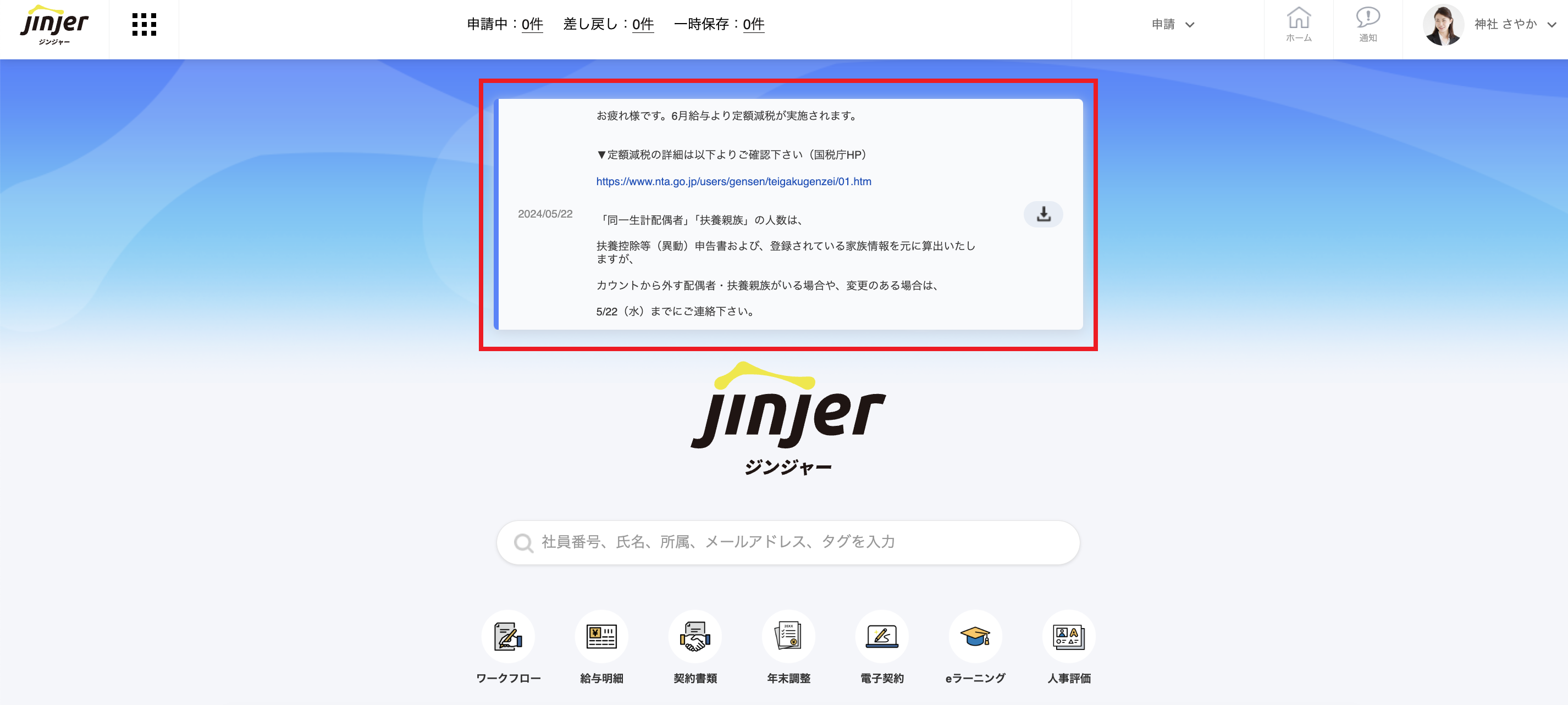 「ジンジャー」は、人事労務・勤怠管理・給与計算などの人事の定型業務から人事評価・eラーニングといったタレントマネジメントまで、1つにまとめて管理できるクラウド型人事労務システムです。
