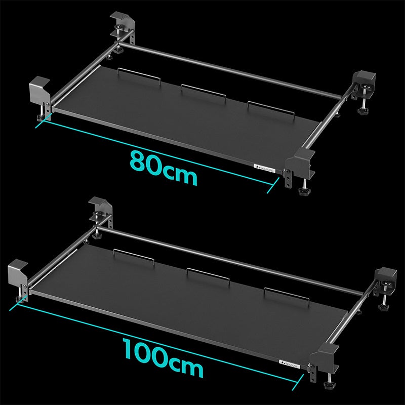本製品は、最大横幅100cmという大型の天板をデスク下に追加することで、メイン天板を占有しがちなキーボードやマウスをスマートに収納。また、ただ広いだけでなく、タイピング時にもグラつかない4点固定による圧倒的な安定性を追求しました。高さは使用するデバイスや環境に合わせて3段階での調整が可能。さらに、取り付ける奥行きを51~80cmまで調整できるので、幅広いサイズのデスクへの取付けが可能です。