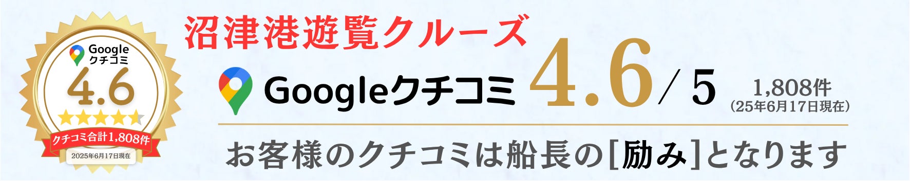 沼津港遊覧クルーズは、Googleのクチコミで1,808件中4.6/5点という高評価をいただいております。