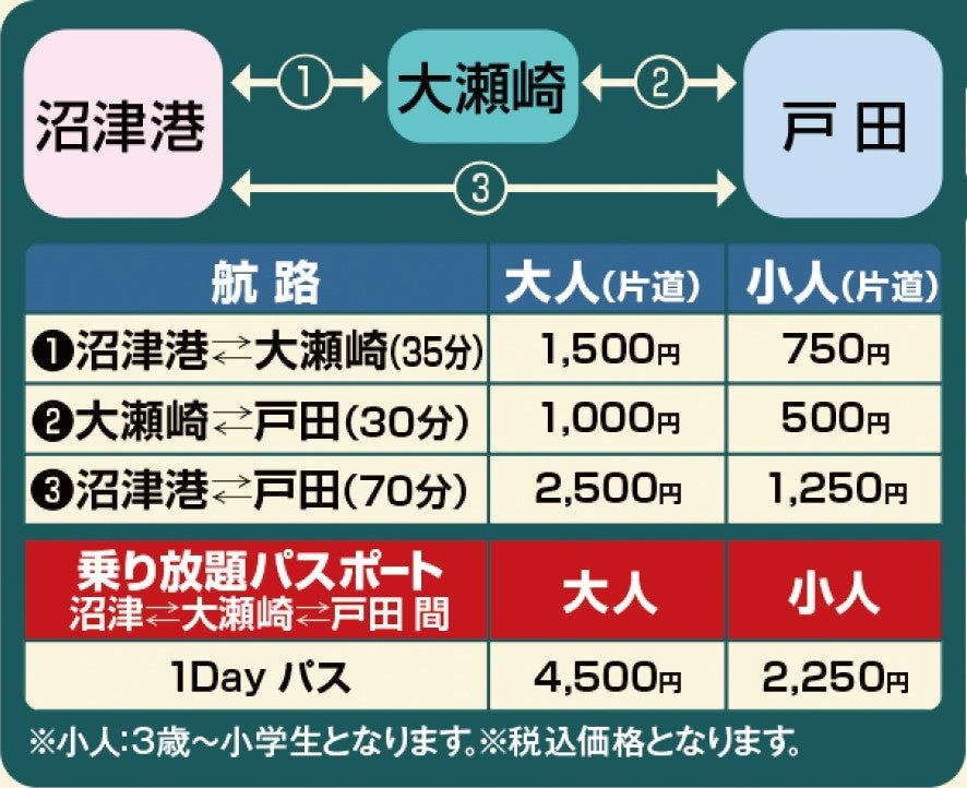 〈乗船運賃(片道)〉 ①沼津港 ~ 大瀬崎(約35分) 大人:1,500円 小人:750円 ②大瀬崎 ~ 戸田 (約30分) 大人:1,000円 小人:500円 ③沼津港 ~ 戸田 (約70分) 大人:2,500円 小人:1,250円 ※上記料金は片道料金です ※小人:3歳~小学生 ※税込価格となります 〈1Dayパスポート(乗り放題)〉 沼津港 ⇔ 大瀬崎 ⇔ 戸田 乗り放題 ※税込価格となります ※小人:3歳~小学生 |