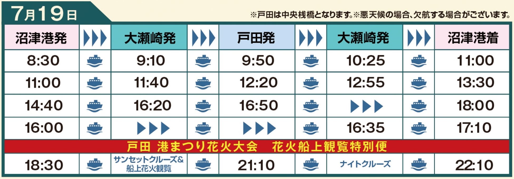 ※16:00沼津港発の船は大瀬崎発から戸田へは、向かわずに沼津港へ戻ります。