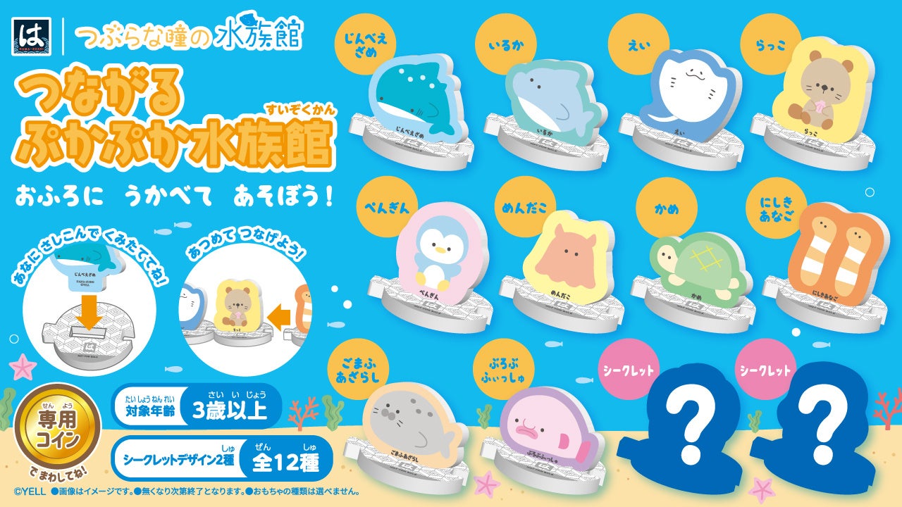 また、つぶらな瞳の水族館が、『つながるぷかぷか水族館』としてはまっこセットに初登場します。付属の台にキャラクターを差し込むと、水にぷかぷか浮かぶおもちゃになります。たくさん集め、つなげて湯船に浮かべれば、まるでお風呂が水族館!シークレットデザイン2種を含む全12種の個性豊かなキャラクターを、ぜひお楽しみください。