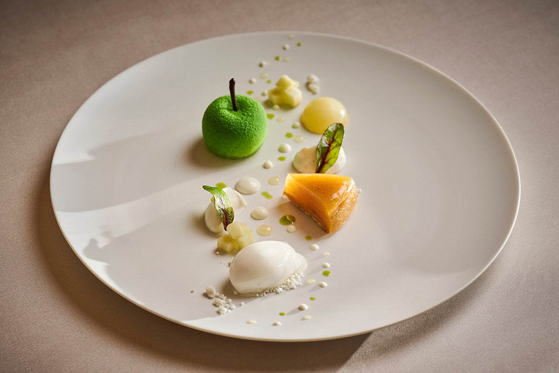 ディナーの幕開けは、フランス料理によるアミューズから。続いて、イタリア料理の前菜、フランス料理の前菜へと、ふたつの世界を行き交うような構成でおたのしみいただきます。コース終盤には、開業当時から総料理長の柳原と共に地元の生産者のもとを訪れてきたシェフパティシエ・石山 直人(いしやま なおと)によるデザートが登場します。フランス料理とイタリア料理、ふたつのエッセンスを取り入れたデザートが、美しい余韻とともにコースを締めくくります。