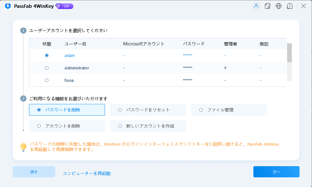 Step5:アカウントとパスワードを削除機能を選択して「次へ」をクリックします。