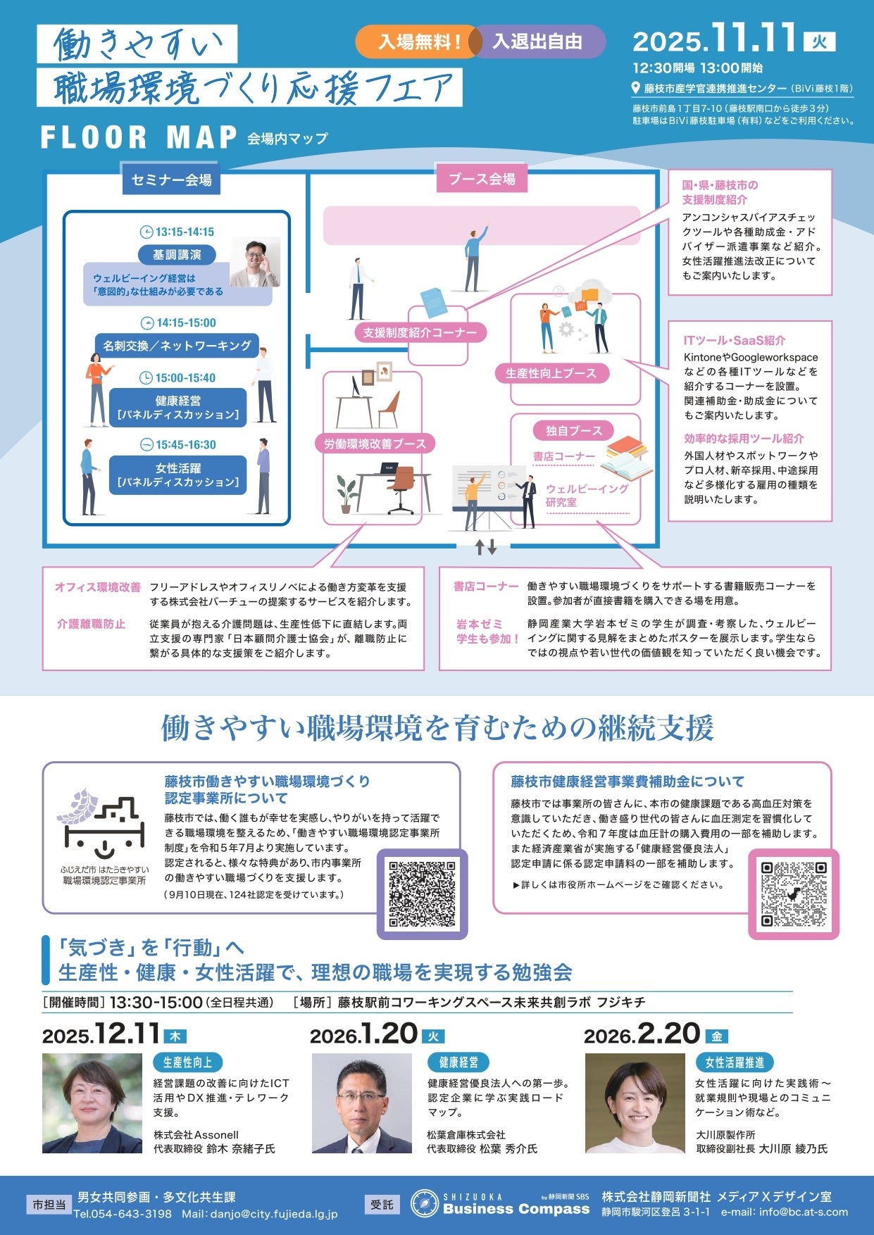 ・生産性・健康・女性活躍で理想の職場を実現するため、応援フェアの後日に勉強会を3回開催します。