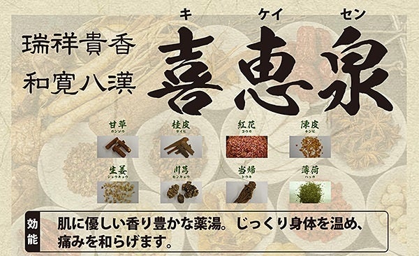この薬湯風呂では、桂皮や生姜、薄荷などが入った「喜恵泉」、陳皮や山梔子、蕃椒がブレンドされた「健喜泉」など、肌に優しく、美肌効果や保湿効果が期待できる薬湯が楽しめます。5種類の薬湯は週替わりで提供され、各回異なる効能を体感していただけます。