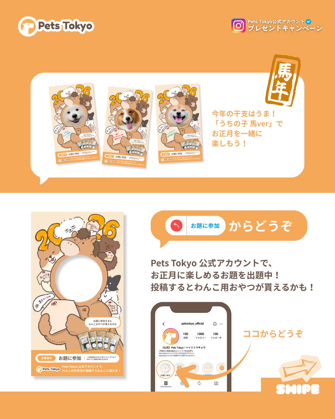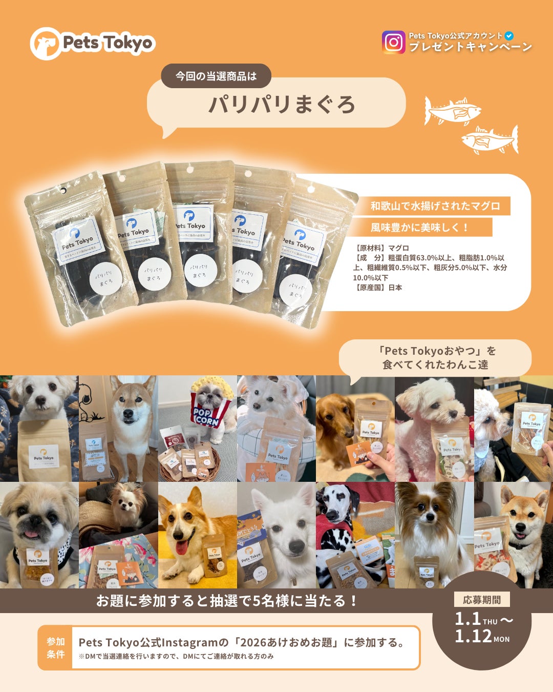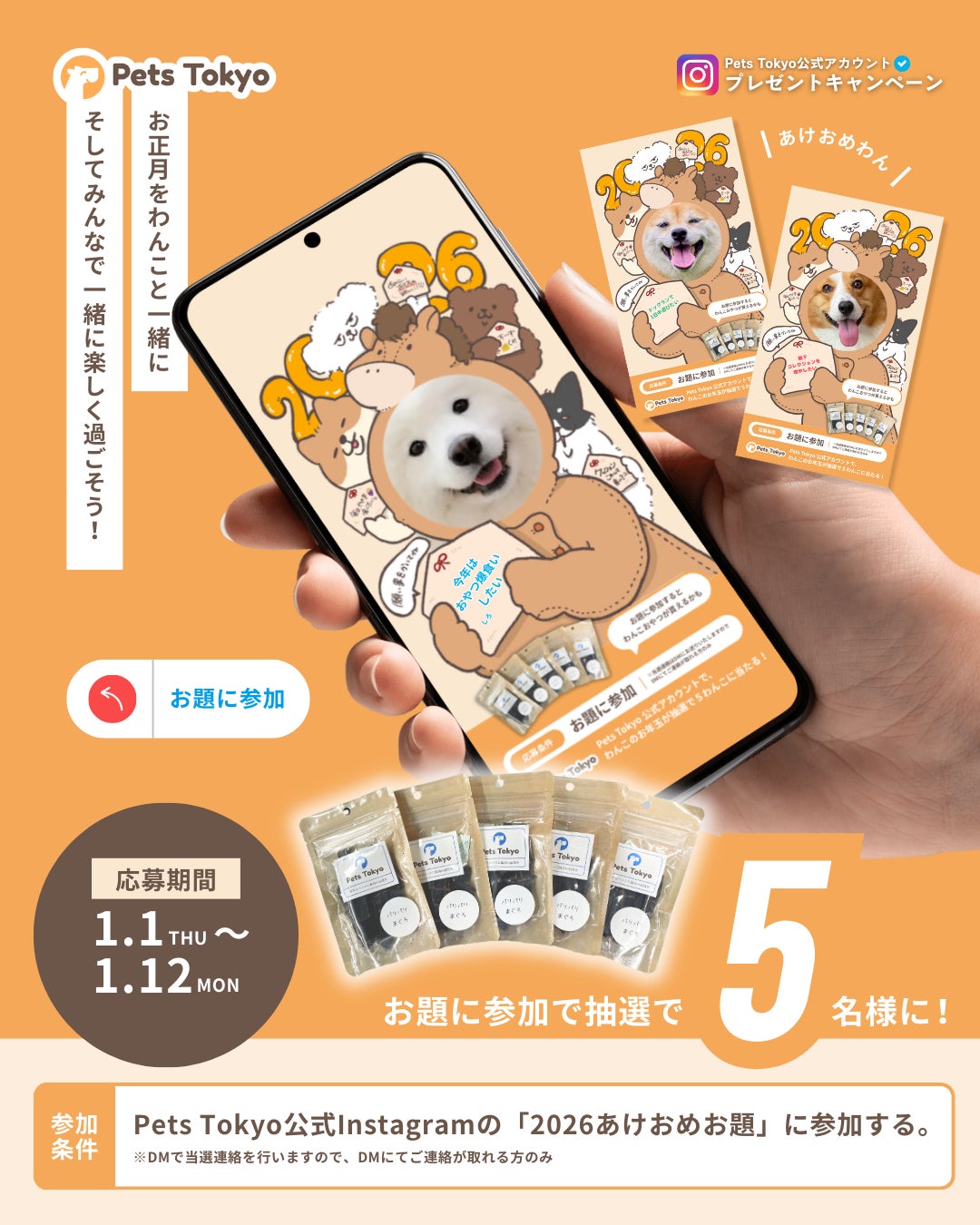 Lehman Holdings株式会社のグループ会社である、Pets Tokyo株式会社(本社:東京都千代田区、代表取締役:Raymond)は、「あけおめお題に参加でおやつを当てよう!」を公式Instagramにて開催いたします。当キャンペーンでは、お家時間が長くなるお正月にうちの子と楽しい時間を過ごして欲しいという想いで行っております。