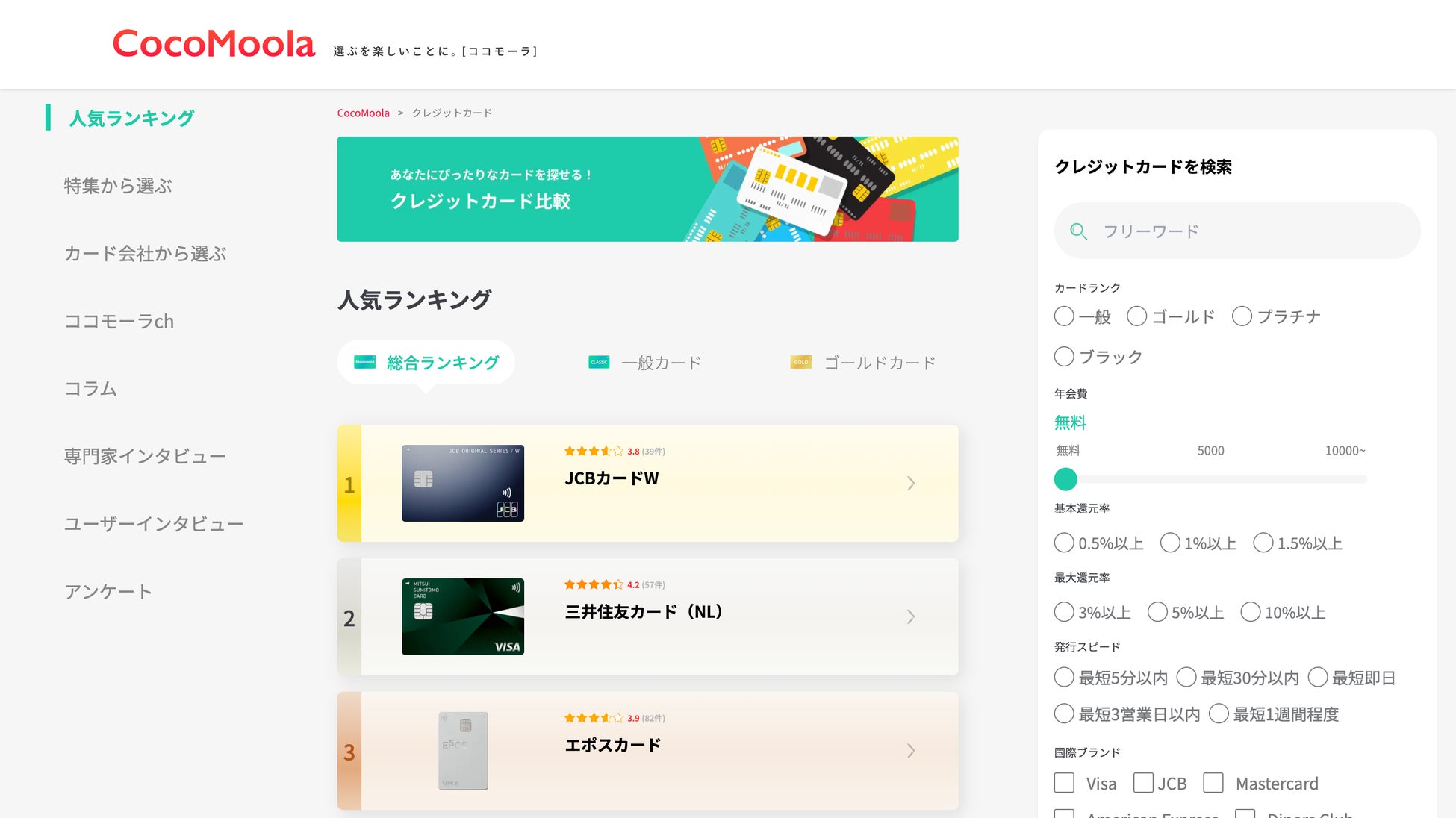 【ココモーラ】クレジットカードのトップページをリニューアルしました