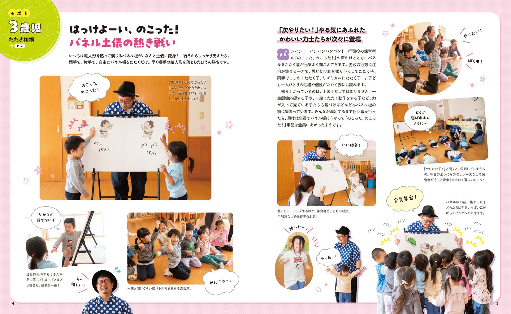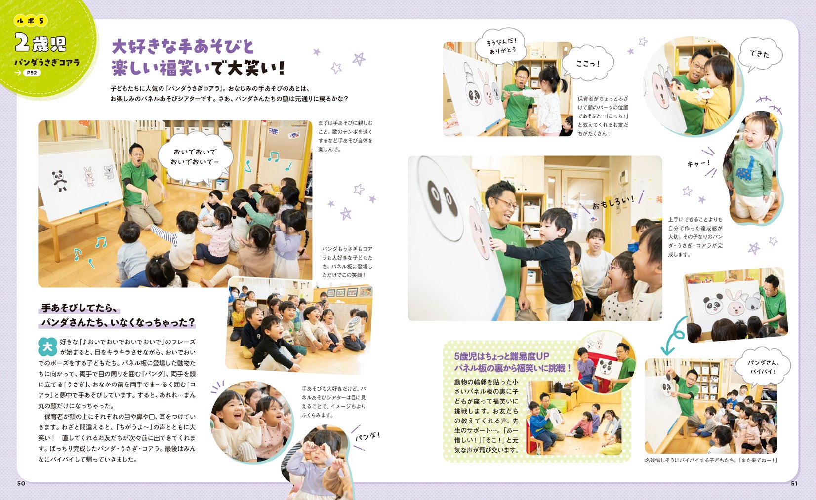 プラン考案の小沢かづとさん、酒井基宏さんが、実際に子どもたちの前でどのように演じているかがわかる、ルポページも設けました。「みなさんらしいあそび方で、あそびを育てていってくれたら最高にうれしい(小沢さん)」「子どもと笑い合って共感しながら、心地よさを築いてほしい(酒井さん)」。子どもたちの反応を引き出し、盛り上げるコツが満載です。