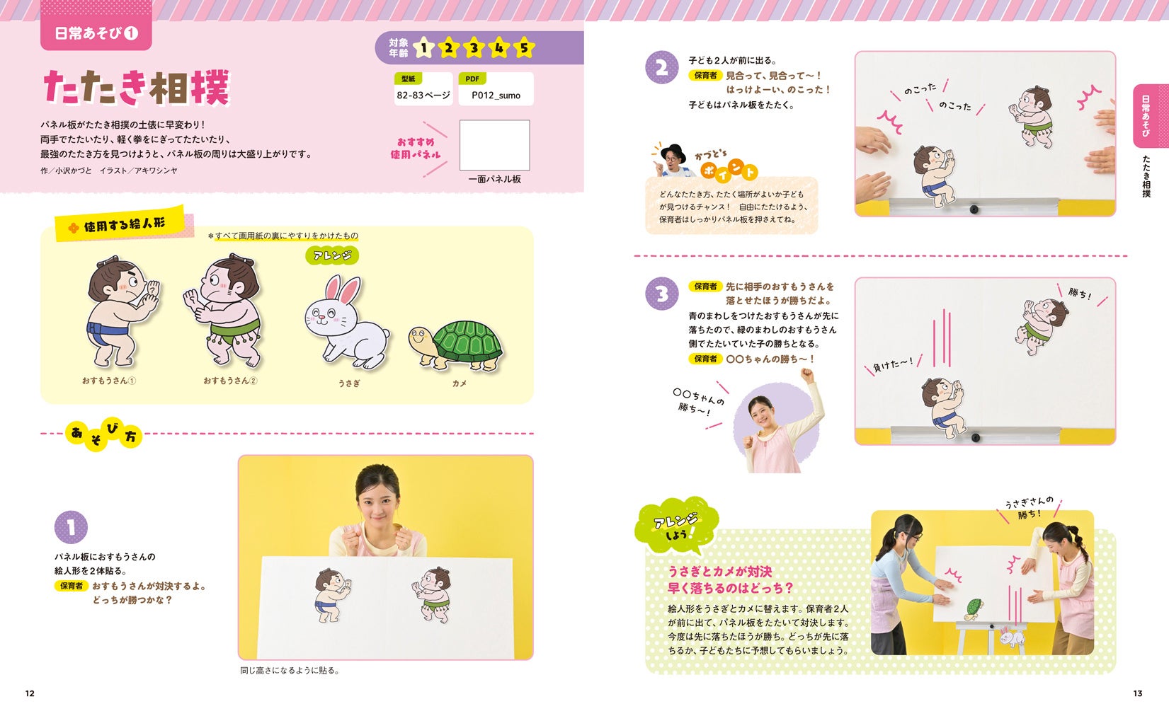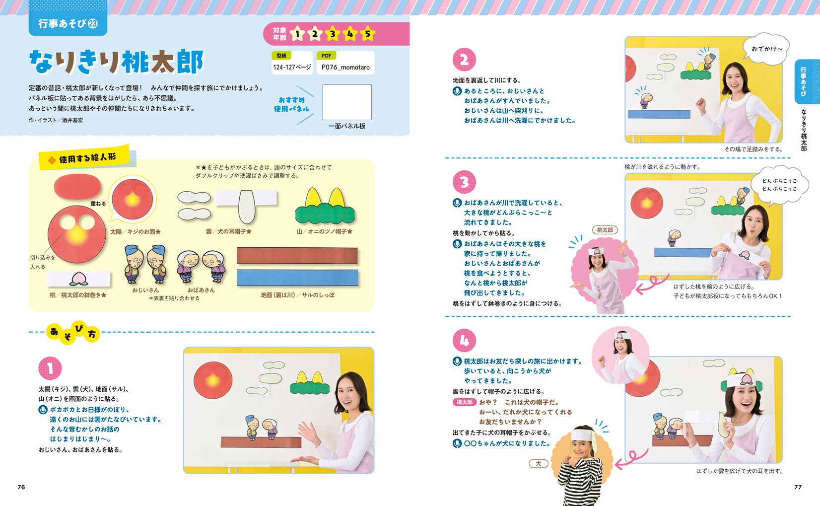 保育者が演じるだけでなく、パネルをたたく、あおぐ、絵人形を並べるなど、子どもが主体的に参加できる23のシアターを紹介