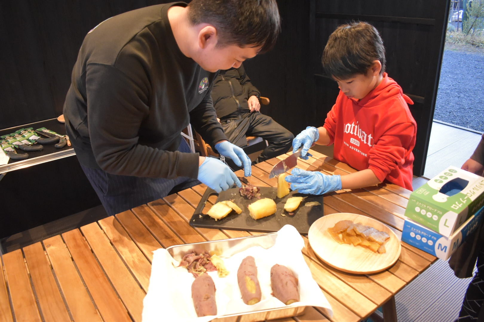 参加者は伊勢志摩BASEスタッフのレクチャーを受けながら、芋をふかした後、皮むきや包丁でのスライスを行いました。