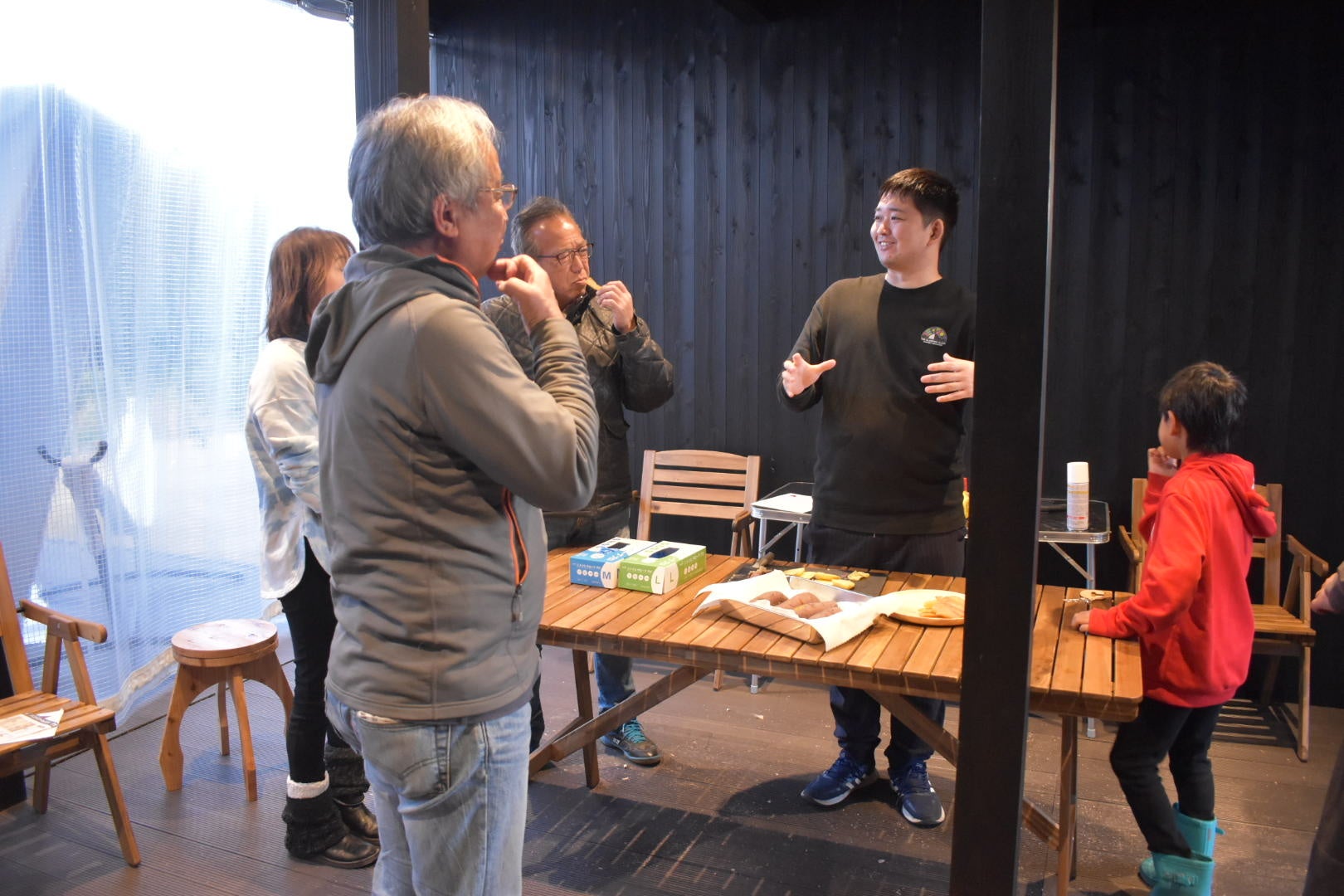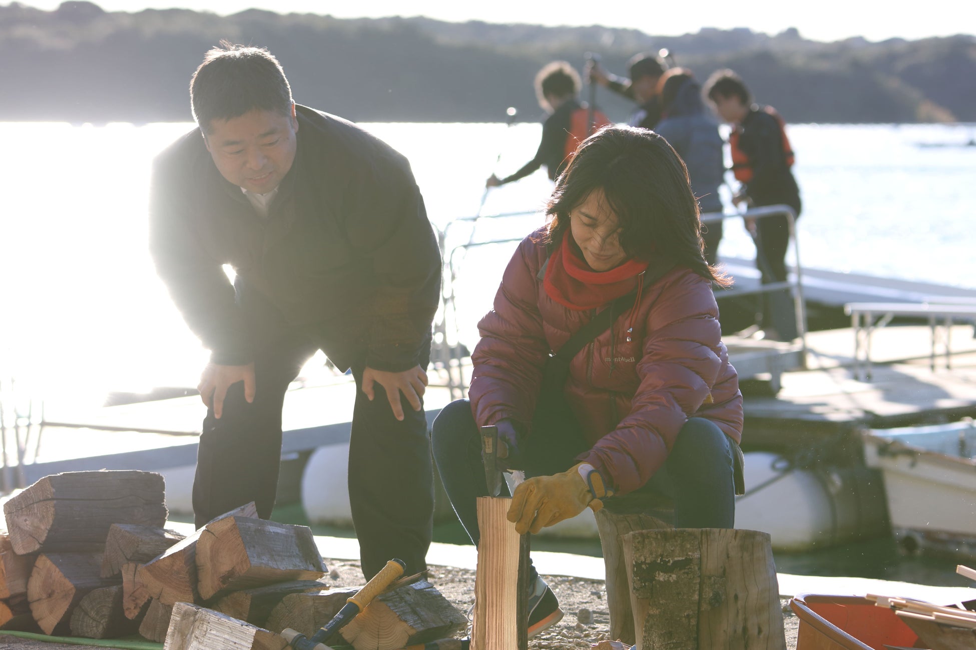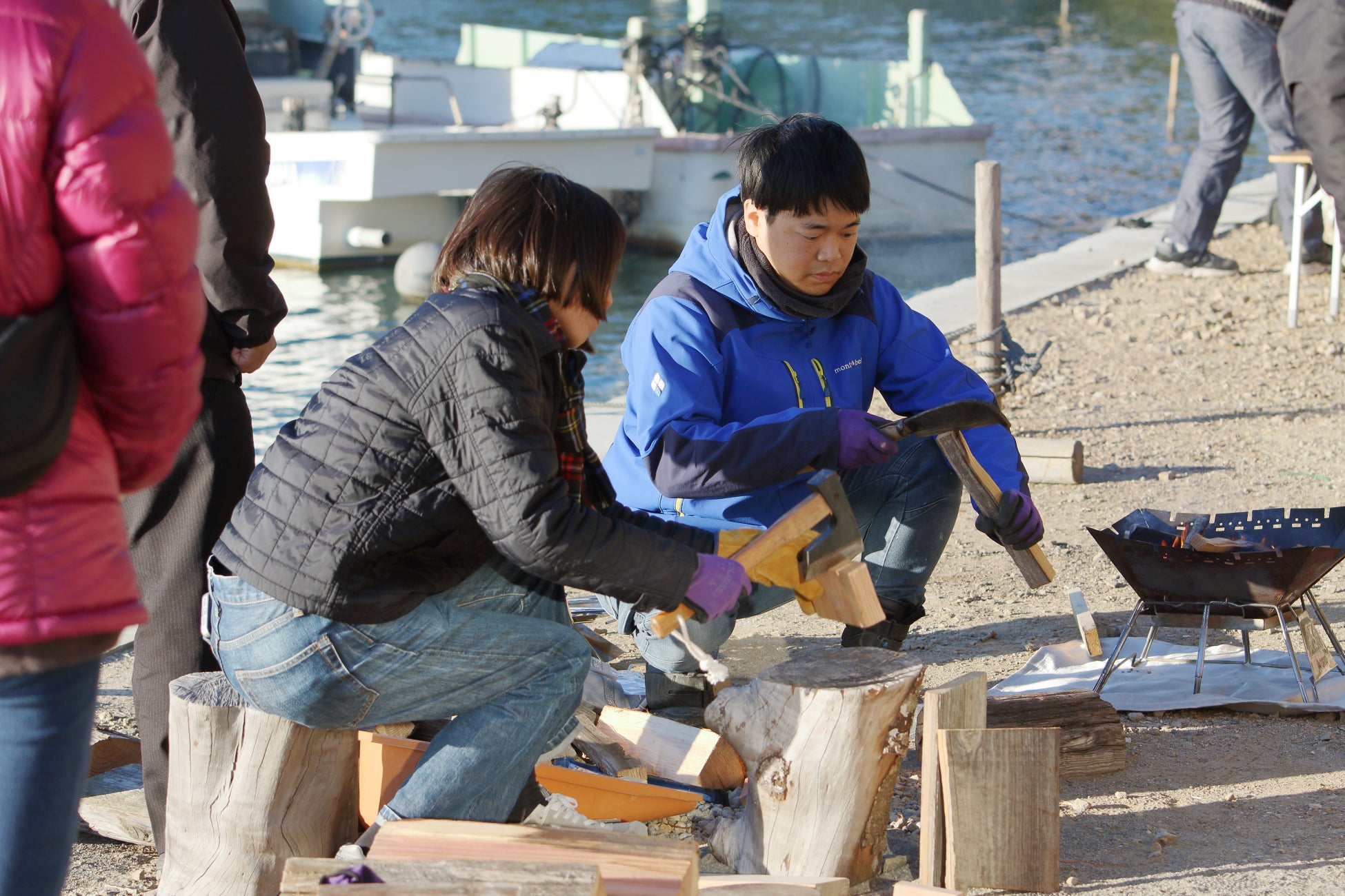 うみらぼのスタッフが斧の使い方をレクチャーし、その後は参加者で薪割りと焚き火を楽しみました。