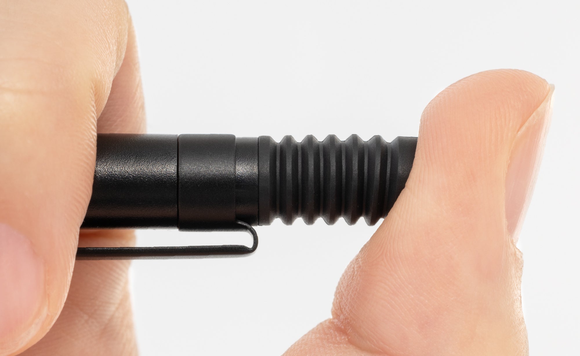 小さな四角のラバーが特徴的なグリップは、指先にフィットし、滑らずしっかり握ることができます。また、前軸全体が真ちゅう製のためペン先側がやや重い低重心となり、バランスの良い書きやすさが特徴です。