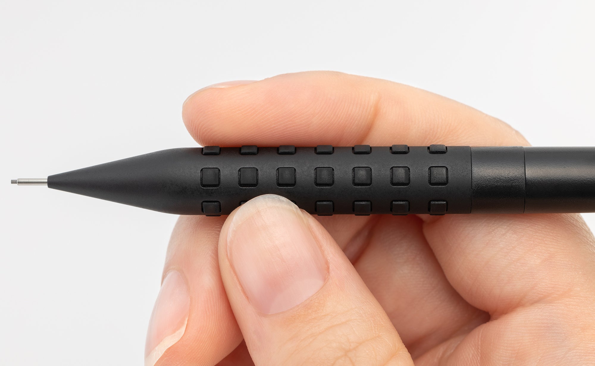 シャープペンでは珍しく「先金(さきがね)」と呼ばれるペン先部分と、グリップが一つのパーツでできています。グリップとペン先が一体化しているため、筆記中にペン先が緩むことがありません。
