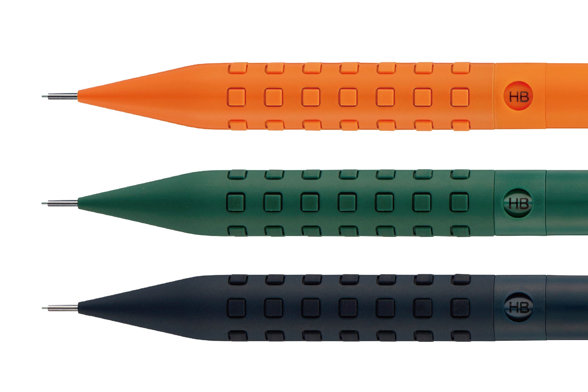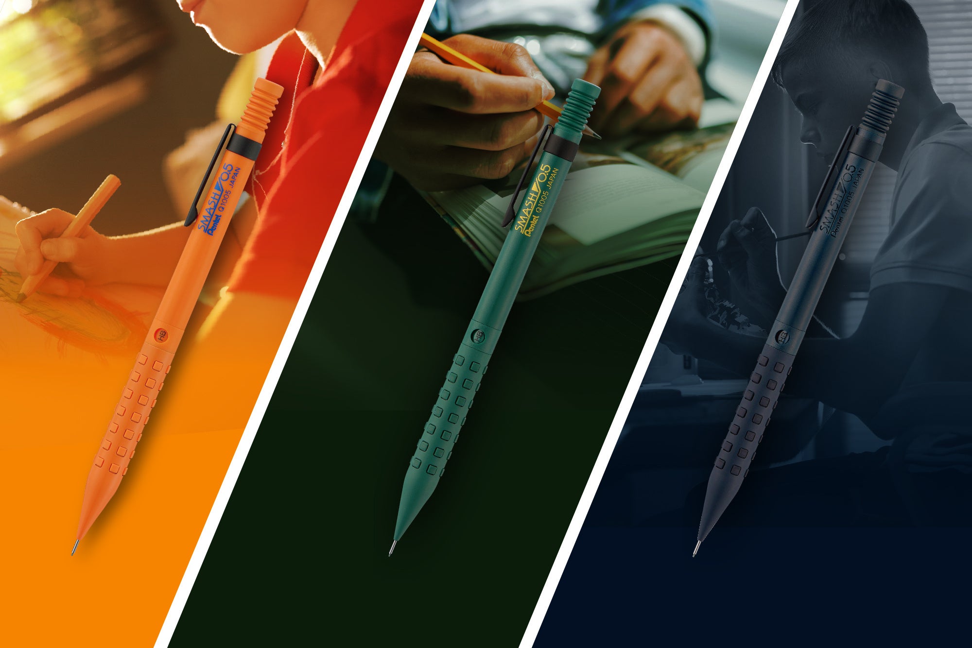 1986年に先行して発売していた製図用シャープペン「グラフ1000」をベースに、タフに使える一般向けシャープペンとして1987年に発売しました。特徴的なフォルムを生み出しているペン先と一体型のグリップは、筆記時のペン先の緩みを無くし、ブレない書き心地を支えています。2022年の発売35周年を機に「どう書くかは自分が決める」というキャッチコピーに刷新し、定番のブラックに加え、レッドとダークグレーを追加し、「書きたいように書ける」という“スマッシュらしさ”を体現した3色を新定番色にしました。