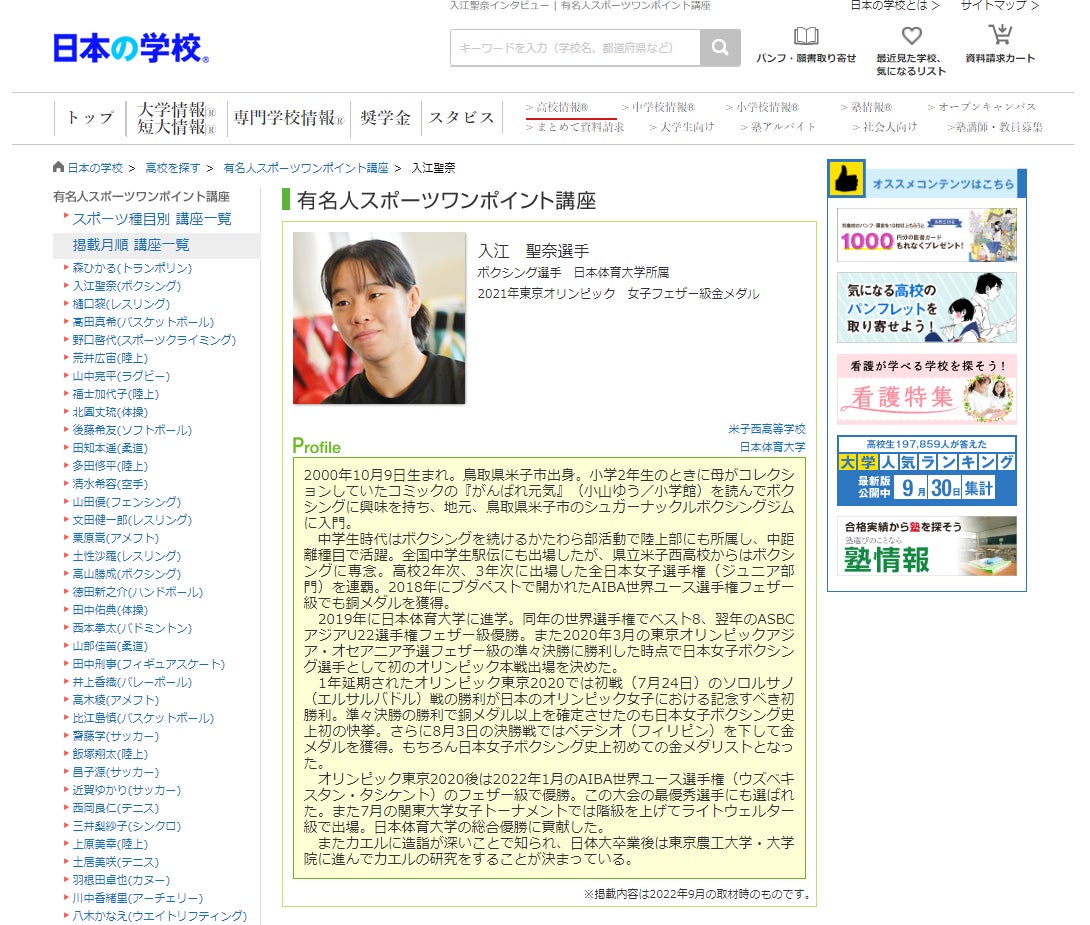 全国の大学・短大・専門学校などの学校情報を提供する、株式会社JSコーポレーション(本社:大阪市北区 代表取締役社長:米田英一)は、スポーツワンポイント講座「ボクシング/入江聖奈選手」(https://school.js88.com/scl_h/onepoint-advice/sport?item=28&athlete=201)」を公開しました。