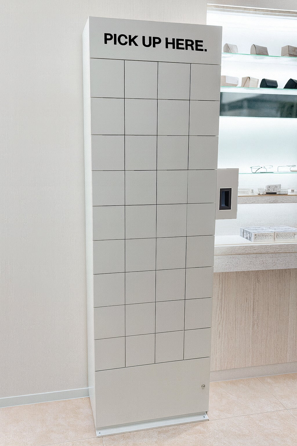 本店舗では、店舗スタッフを介さずに完成したメガネを受け取れるスマートロッカー(PICK UP HERE.)を初めて導入します。従来は、購入後に一度退店したお客様が、商品受け取りの際に再度受付を行う必要があり、手間や待ち時間が発生していました。