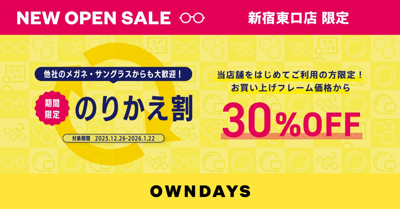 2025年12月26日(金)から2026年1月22日(木)までの期間、OWNDAYS 新宿東口店を初めてご利用いただくお客様を対象に、フレームが30%OFFとなる「のりかえ割」を実施いたします(※4)。他社ブランドのアイウェアをご愛用中の方に加え、過去に他のOWNDAYS店舗をご利用されたことがある方も、新宿東口店が初めてであればご利用可能です。この機会に、快適でスタイリッシュなアイウェアライフをご体験ください。
