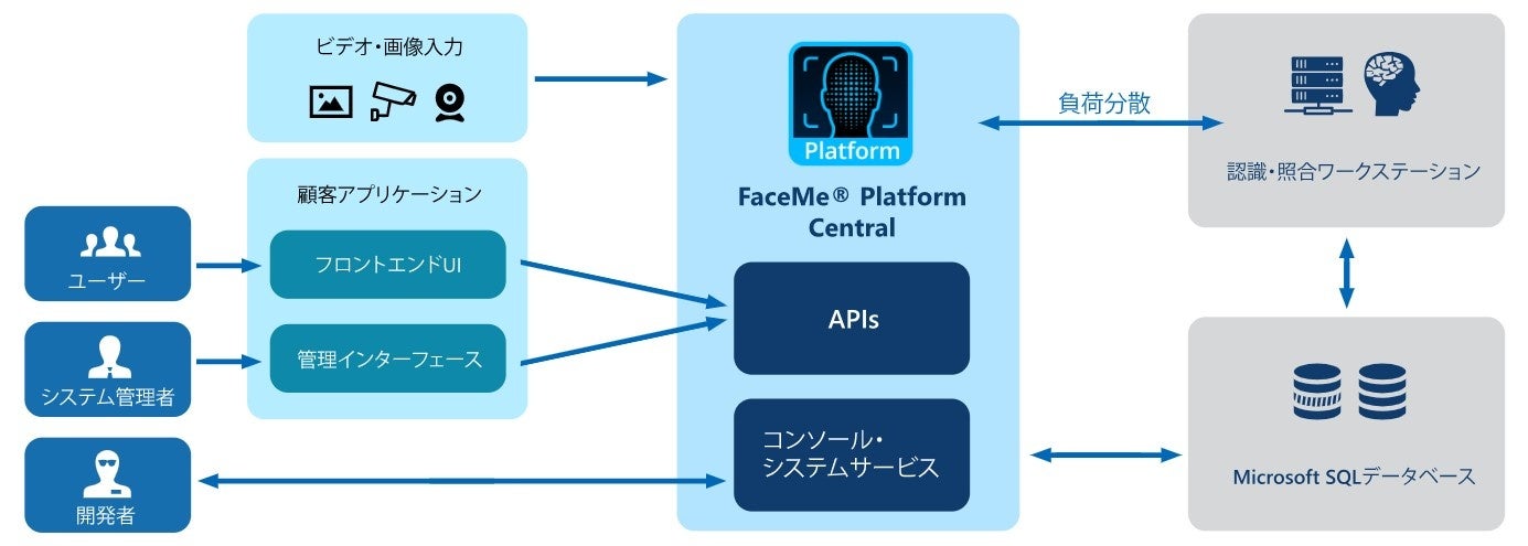 FaceMe® Platformのアーキテクチャは非常に高い拡張性を持っているため、システムにおける顔認証の要求が高まった場合、ワークステーションを追加インストールして台数を増やすだけで、システムは自動的にコンピューティング需要の増加を検知し、最適なパフォーマンスのためのワークロードを再分配します。FaceMe® Platformバージョン5.4では、Dockerコンテナのサポートも追加され、開発者はRed Hat Linuxへのインストール展開がより簡単になりました。