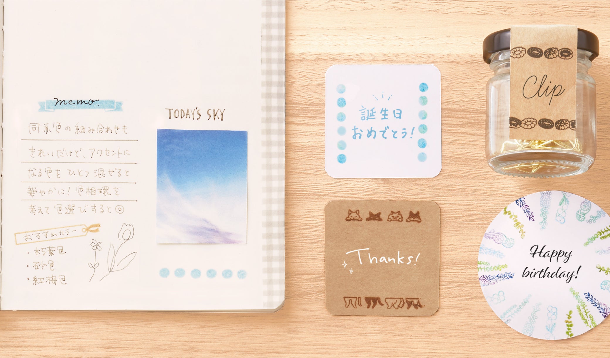 「植物」「ねこ」「食べ物」「飾り」の4種類のデザインをご用意。手帳や日記などのアレンジはもちろん、贈り物に添えるメッセージカードのデコレーションなど、さまざまな場面で使用しやすいデザインです。