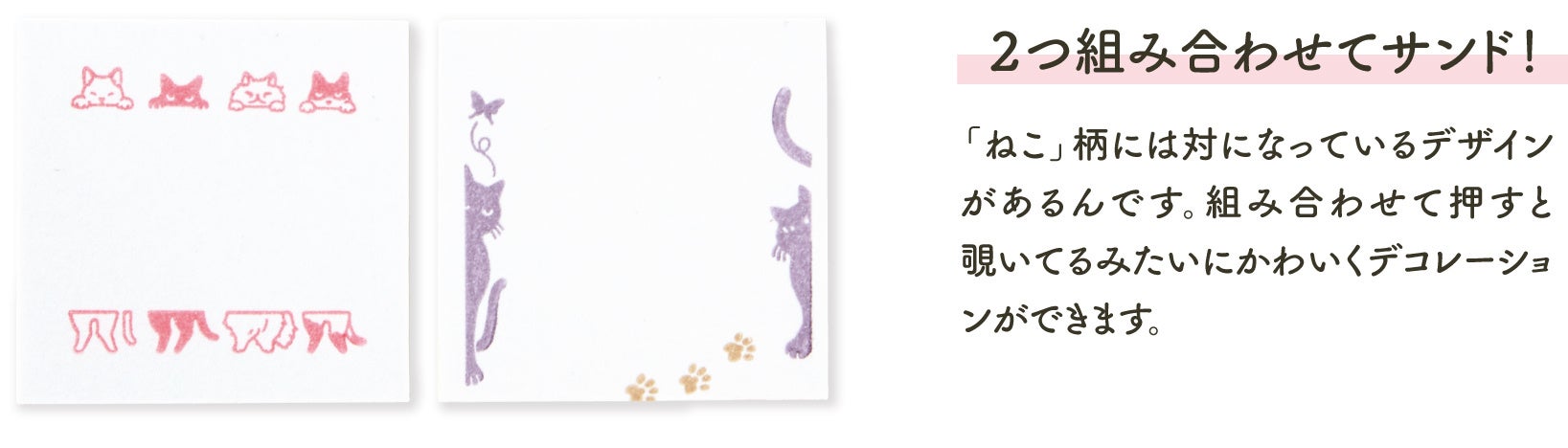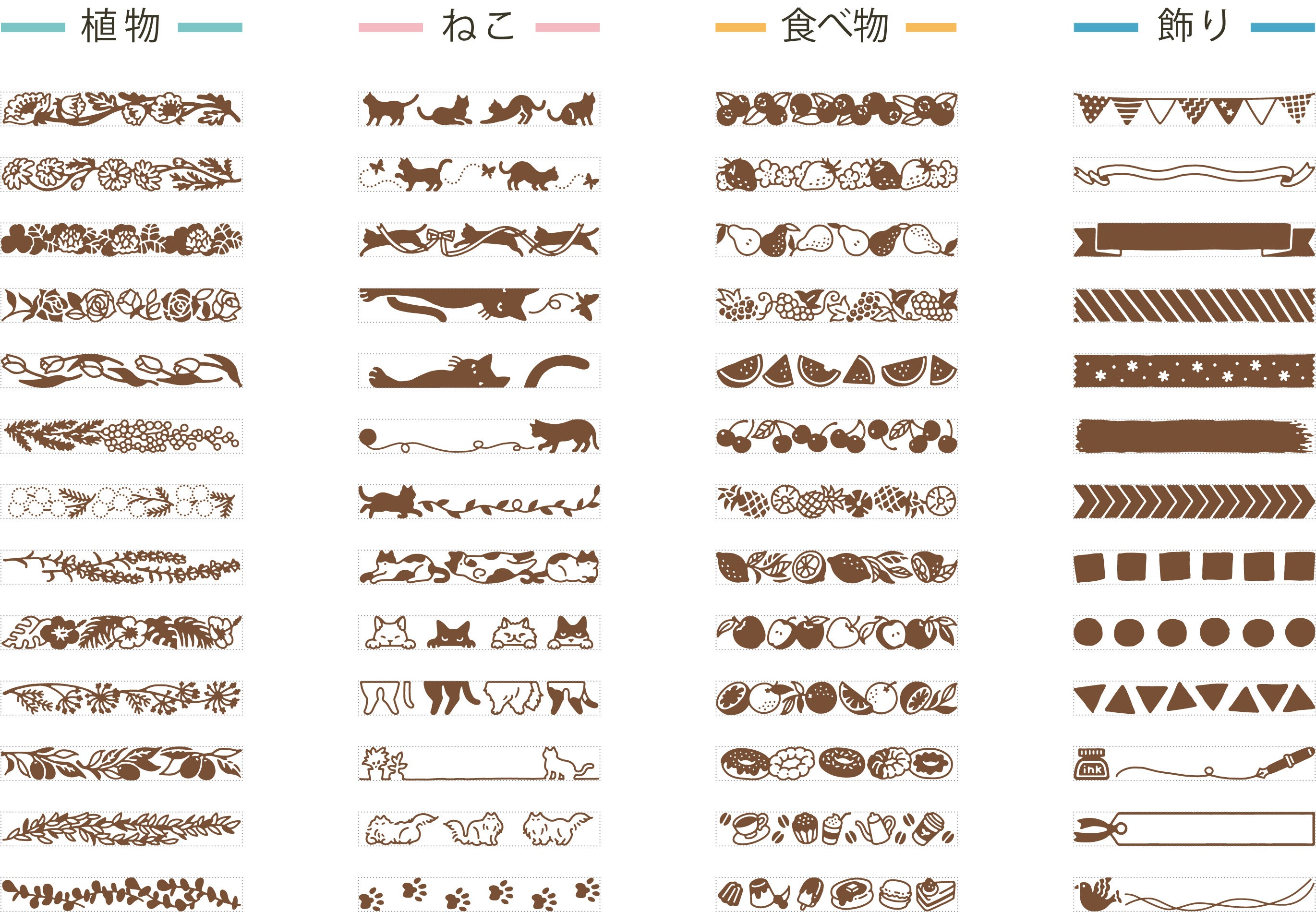 デザインは、「植物」「ねこ」「食べ物」「飾り」の4種類。普段使う手帳のアレンジから、メッセージカードのデコレーションまで、さまざまなシーンで使えるバリエーション豊かなデザインです。