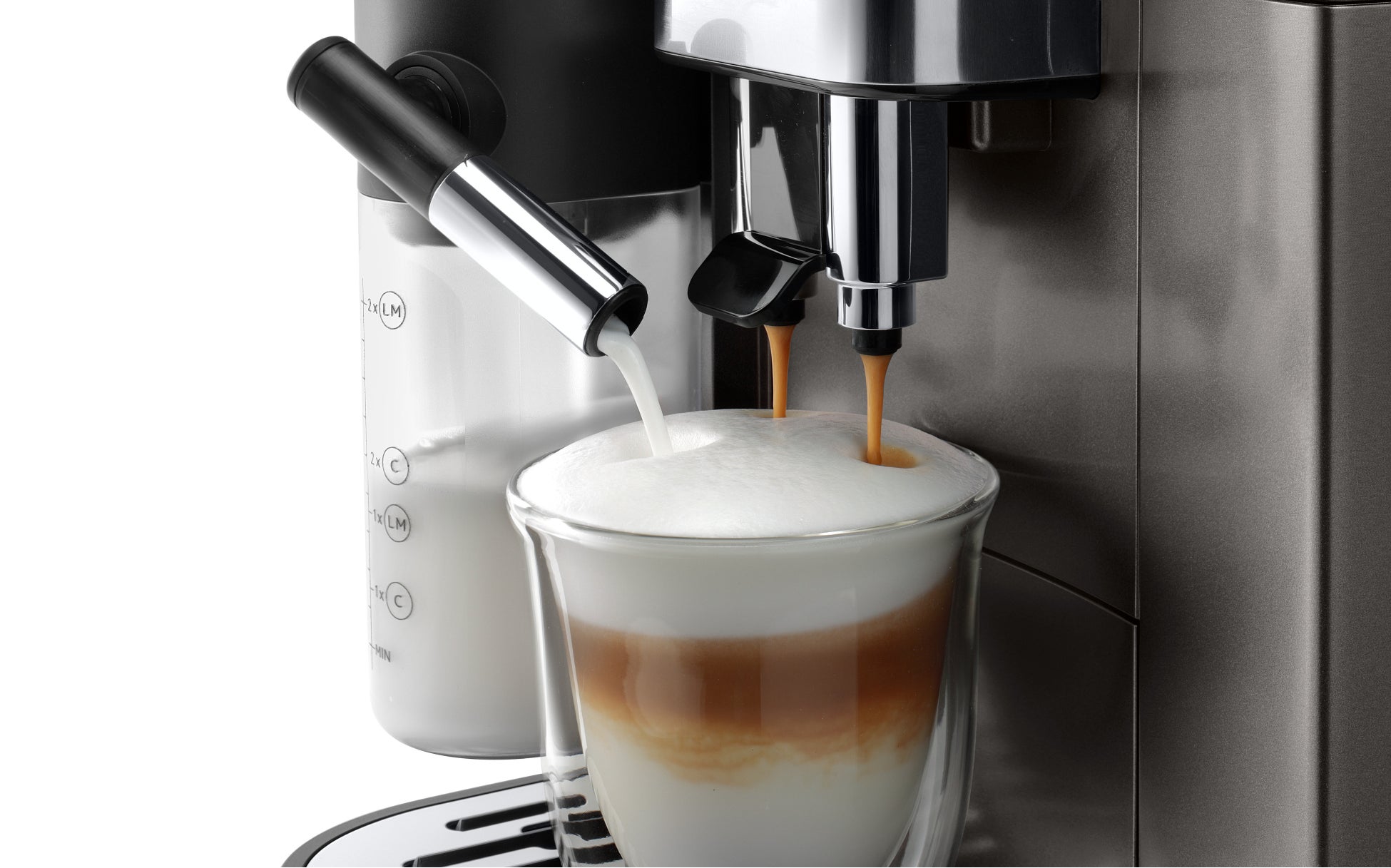 ・カプチーノ(C)とラテマキアート(LM)、それぞれのメニューの目安のミルク量がコンテナのメモリ部分のアイコン表示(C/LM)でひと目で分かります。