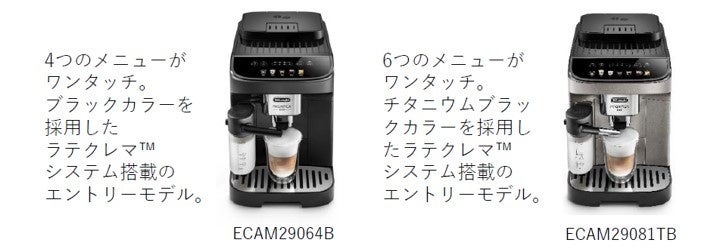 デロンギ独自の新メニュー「マイラテ」など、ECAM29064Bでは4つのメニュー、ECAM29081TBでは6つのメニューをワンタッチで淹れることが可能です。
