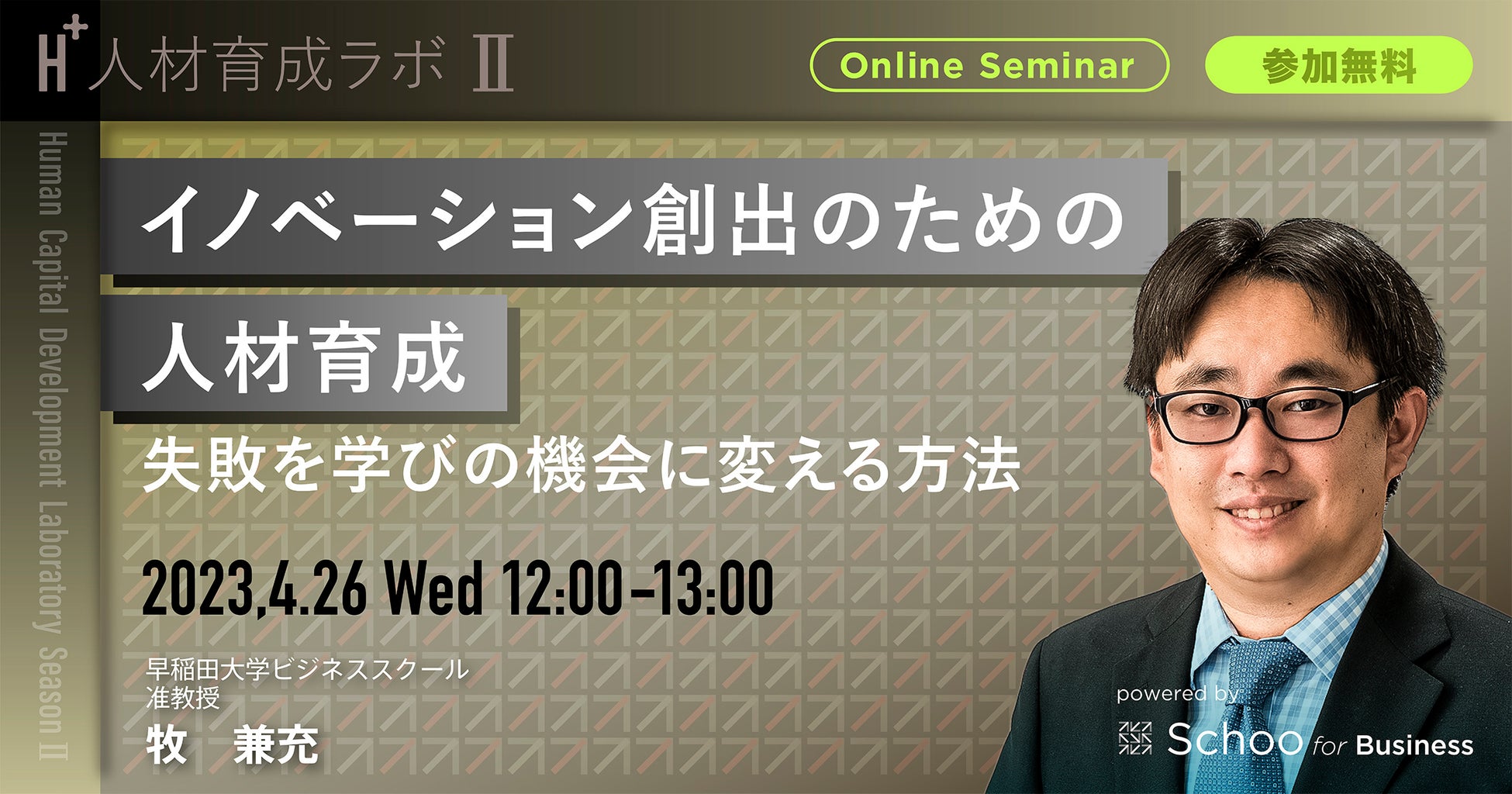 インターネットでの学びや教育を起点とした社会変革を行う株式会社Schoo(本社:東京都渋谷区、代表取締役社長CEO:森 健志郎、以下「スクー」)が提供する法人向け研修サービス「Schoo for Business」は、人的資本経営や組織開発に関連する情報発信やイベントを開催する「人材育成ラボ(H+)」を運営しています。この度4月26日(水)に、早稲田大学ビジネススクールの牧氏をお迎えし、イノベーション創出のための人材育成について解説いただくウェビナーを開催します。参加費は無料です。