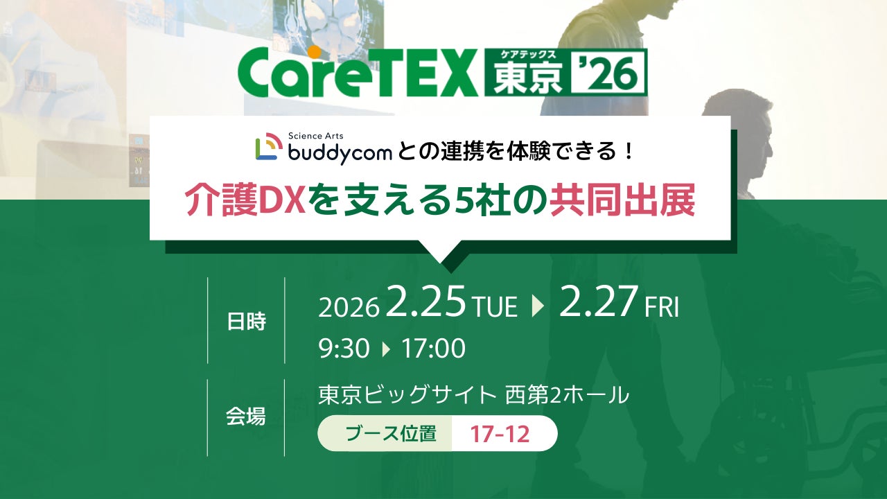 株式会社サイエンスアーツ(所在地:東京都渋谷区、代表取締役社長:平岡竜太朗)は、2026年2月25日(水)~27日(金)に東京ビッグサイトで開催される、介護業界日本最大級のBtoB商談展「東京ケアウィーク’26」内「Care TEX ’26」に出展いたします。