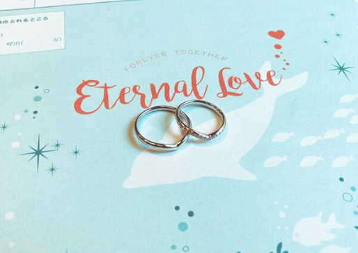 貝殻やサンゴがきらめく海の中でイルカやお魚たちがおふたりの結婚を祝福しているデザインです。 イルカの背中に指輪を置くと幸せを運んでいるかのよう!海の仲間たちの他にも人魚の姿もチラリとうつるかわいらしいデザインです。