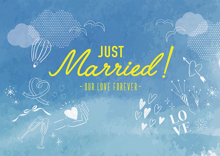 爽やかな青空に、おふたりの喜びがはじけているイメージのさわやかなデザインです。どこまでも広がる空の下を、おふたりがいつまでも笑顔で歩んでいけますように。