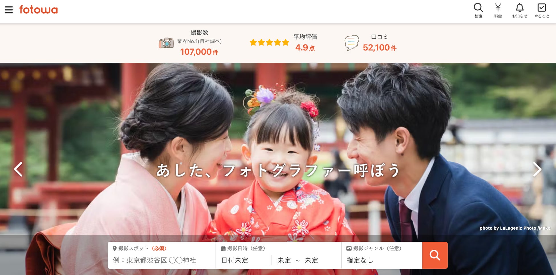 「fotowa」は、撮影して欲しい人とプロのフォトグラファーをつなぐ、家族・子ども向けの出張撮影プラットフォームです。シンプルな料金設計と、好きな場所に好きな作風のフォトグラファーを指名して撮影予約ができるのが特徴。