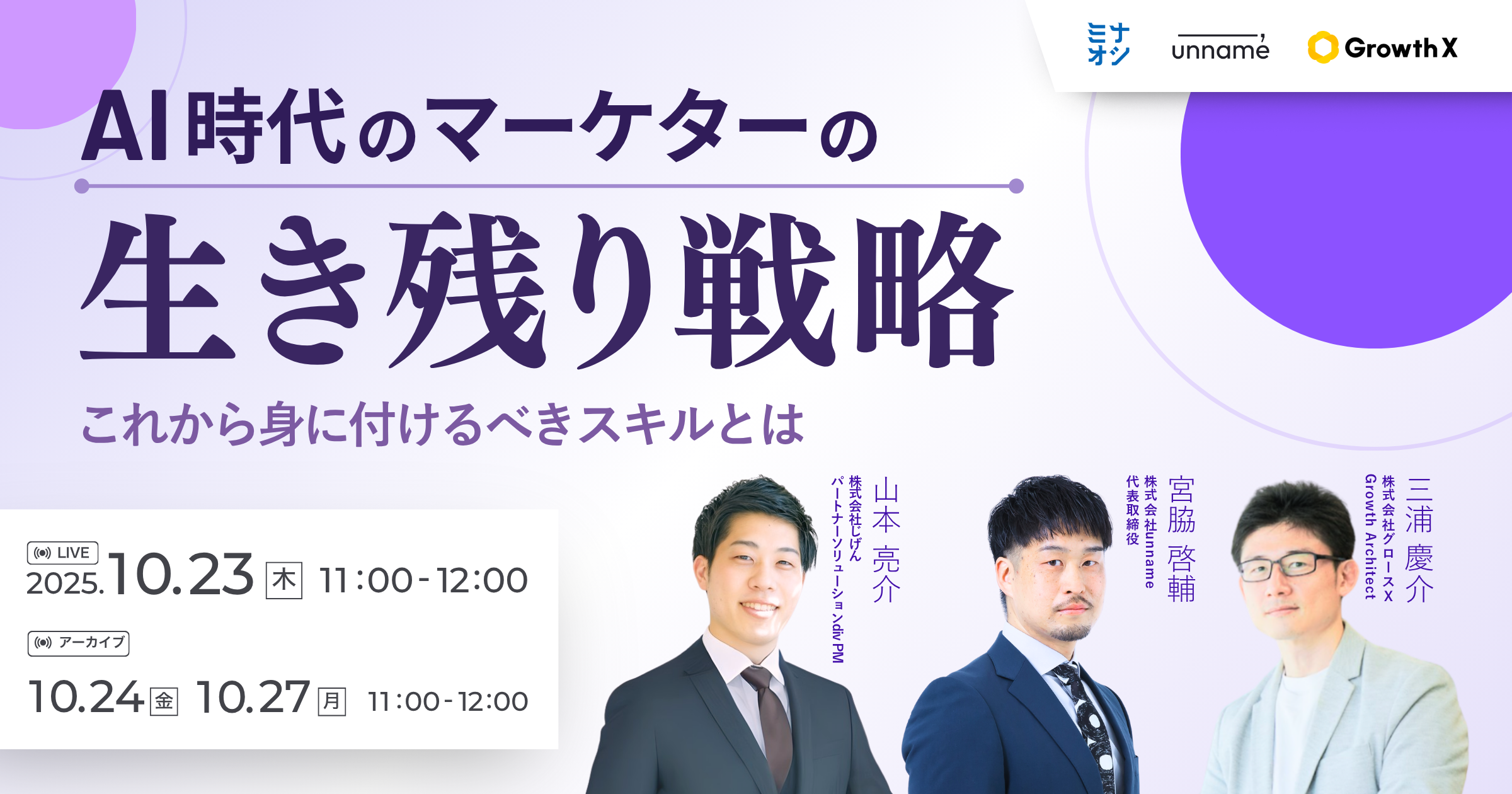 株式会社じげん(本社:東京都港区、代表取締役社長執行役員CEO:平尾丈、東証プライム:3679)が運営する、実名制レビューが特徴のツール・サービスレビューメディア『ミナオシ』(https://3naoshi.com/)は、2025年10月23日(木)に無料のオンラインセミナー『AI時代のマーケターの生き残り戦略~これから身に付けるべきスキルとは~』を開催します。
