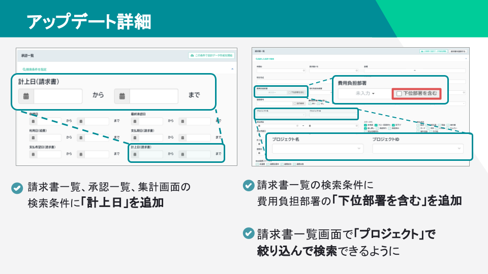また請求書一覧画面では、プロジェクト名/プロジェクトIDによる検索や、費用負担部署の検索時に、部署の下に配置される組織を含んで検索できるようになり、請求書一覧から目的の請求書をさらに見つけやすくなっています。