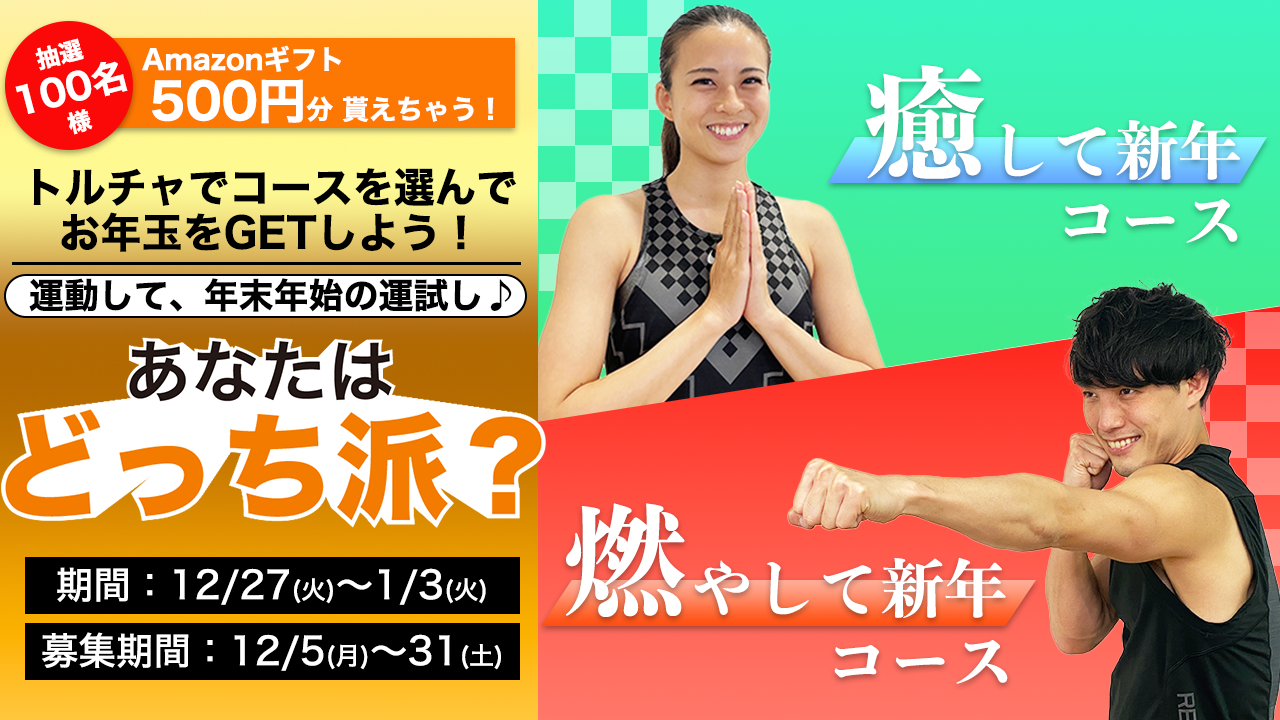 関東・関西・東海地区に総合フィットネスクラブおよび24時間トレーニングジムを展開する株式会社ティップネス(本部:東京都千代田区、代表取締役社長:酒巻 和也)は、年末年始のおうち時間をサポートすべく、オンラインフィットネス配信サービス『torcia(トルチャ)』にて、年末年始特別企画「#癒して新年 #燃やして新年 あなたはどっち派?」を12月27日(火)から1月3日(火)までの1週間開催します。