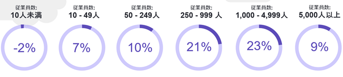 日本国内の組織規模別調査では、全ての組織規模で増員予定となっています。従業員数1,000人-4,999人の組織が、前四半期比12ポイント増の純雇用予測+23%となり、最も高い雇用予測です。