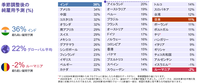 純雇用予測は、42カ国・地域のうち40ヵ国・地域がプラスと回答しています。日本の雇用意欲は、前四半期比1ポイント増となり、堅調な予測となりました。
