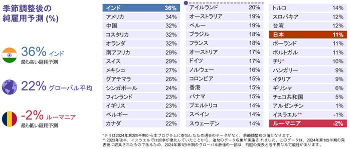 42ヵ国・地域純雇用予測:グローバル平均は+22%、日本は+11%