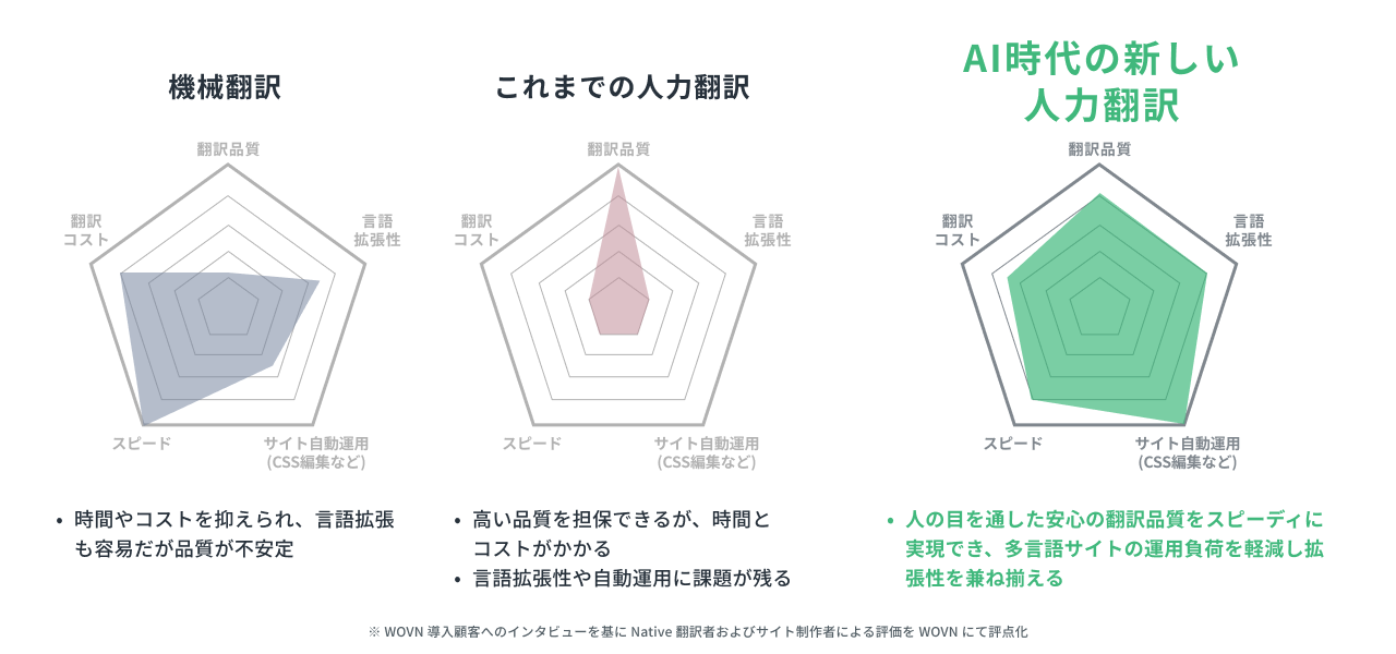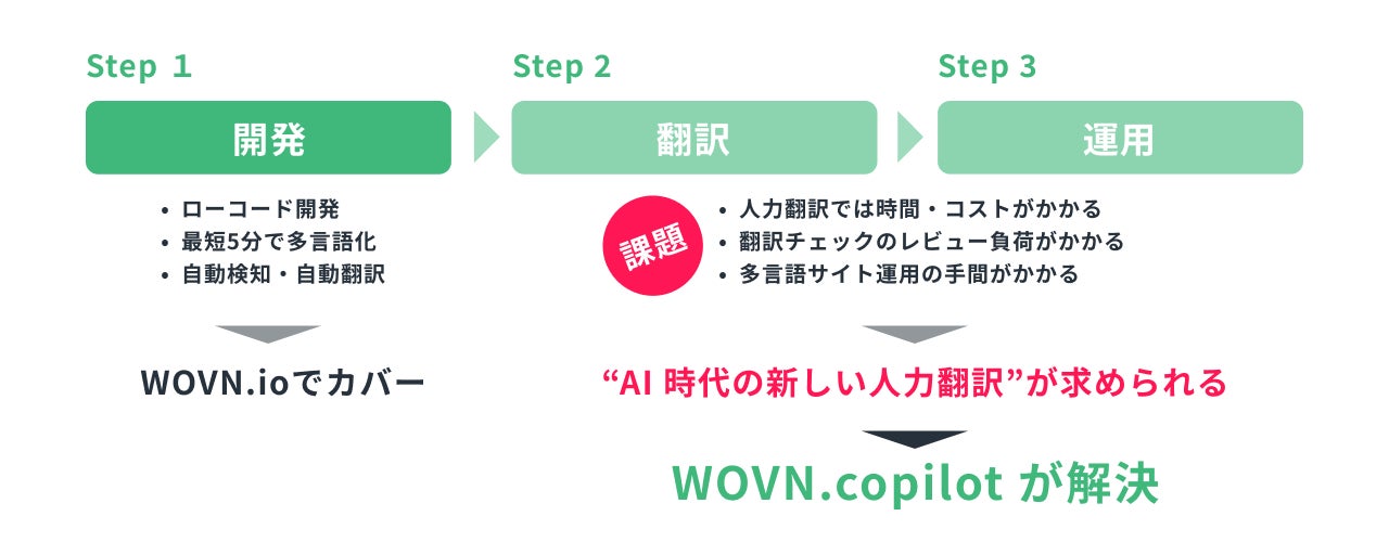 Web サイト多言語化には「開発・翻訳・運用」の3つのステップがあります。WOVN.io では、これら全てを効率化する機能を提供してきましたが、「翻訳・運用」に関しては以下の課題を抱えていました。
