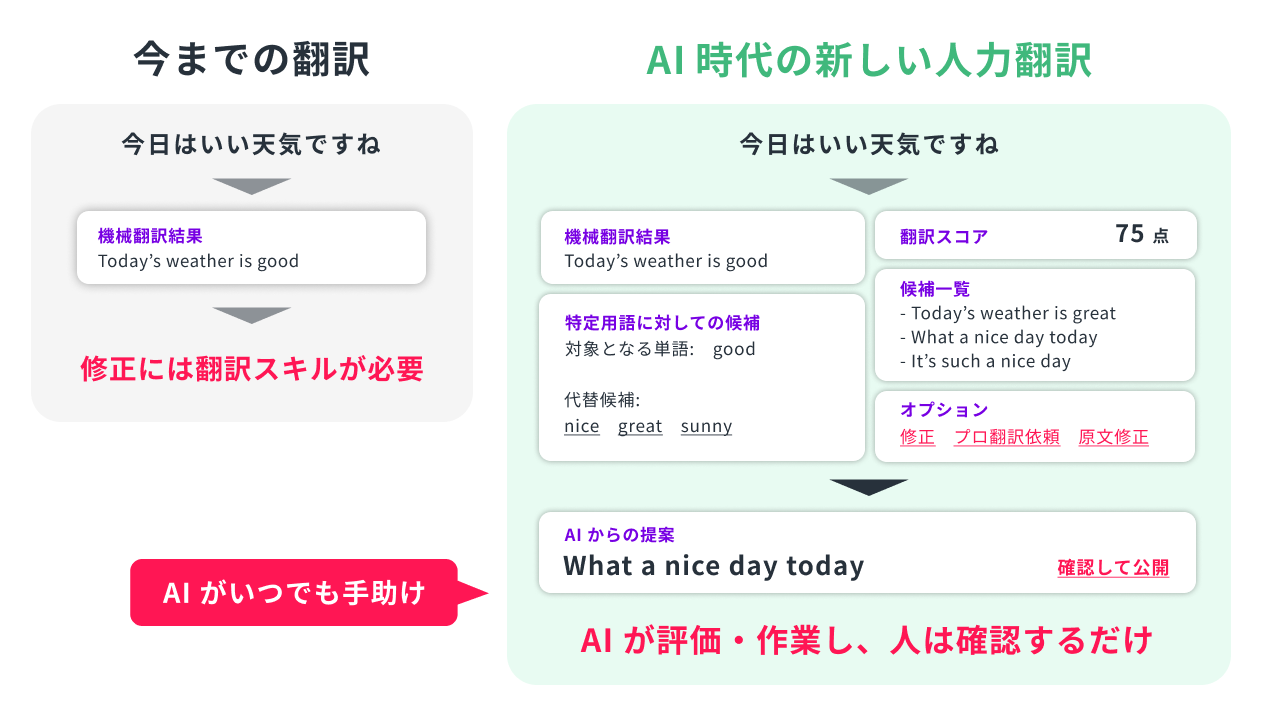 問題がある場合は、該当箇所の指摘・修正提案が行われ、翻訳運用者によって確認・承認が可能になります。