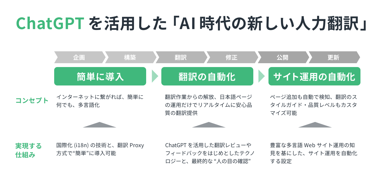 ChatGPT との連携により、翻訳未経験者でも、翻訳結果を評価・修正できるようになります。具体的な仕組みは以下のとおりです。