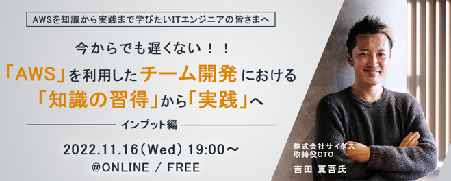 本セミナーは、「AWS」を利用した最新のアーキテクチャと、それをチーム開発するための「ローカル開発環境」から「CI/CDパイプライン」までを実践的に学ぶことのできるセミナーです。株式会社サイダス 取締役CTO 吉田真吾氏を講師に迎え、2部構成で実施。第1部となる本セミナーでは、座学編(インプット編)として、実践に必要となる知識を網羅的にインプットしていだたきます。そして1月に開催予定の第2部では、本セミナーにてインプットした知識を活用する場として、ハンズオンセミナーを実施いたします。