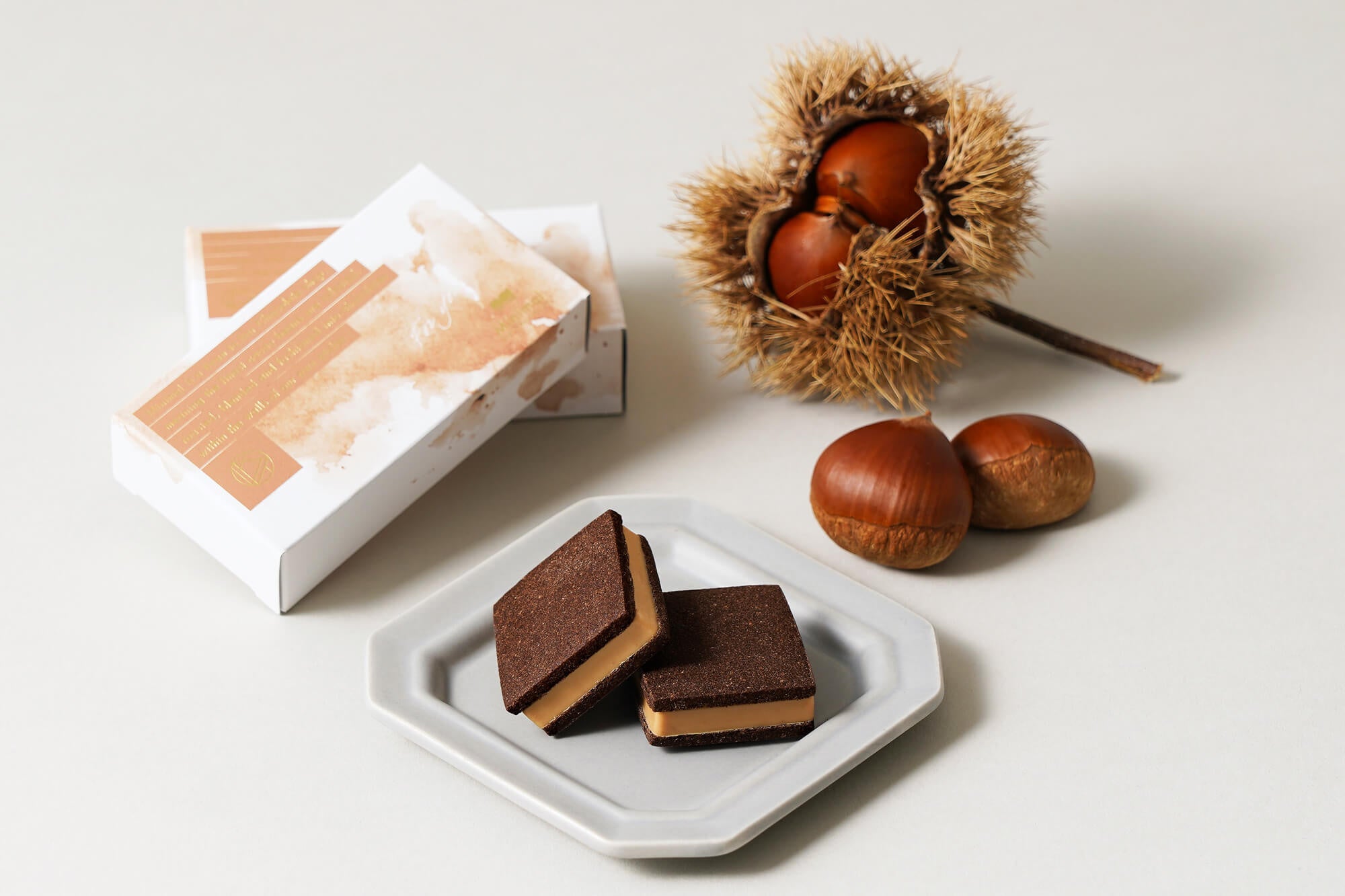 ブロンドチョコレートを使ったガナッシュに栗をあわせ、さっくりとしたビターなクッキーでサンドしました。香り高くほんのり甘い栗の風味と、キャラメルのようにコクのある甘さをもつブロンドチョコレート、そしてそれらをひきたてるビターなクッキーが合わさることで、まるでモンブランスイーツのような贅沢で満足感のある味わいをお楽しみいただけます。