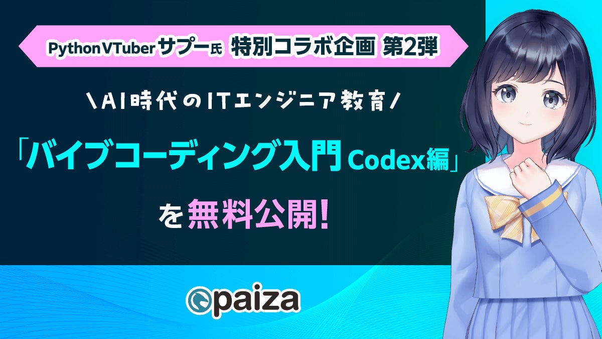 ITエンジニア向け転職・就職・学習プラットフォーム「paiza(パイザ)」を運営するpaiza株式会社(東京都港区、代表取締役社長/CEO 舘康人)は、Python VTuberサプー氏と共同開発した新講座「バイブコーディング入門Codex編」の提供を本日より提供開始いたします。
