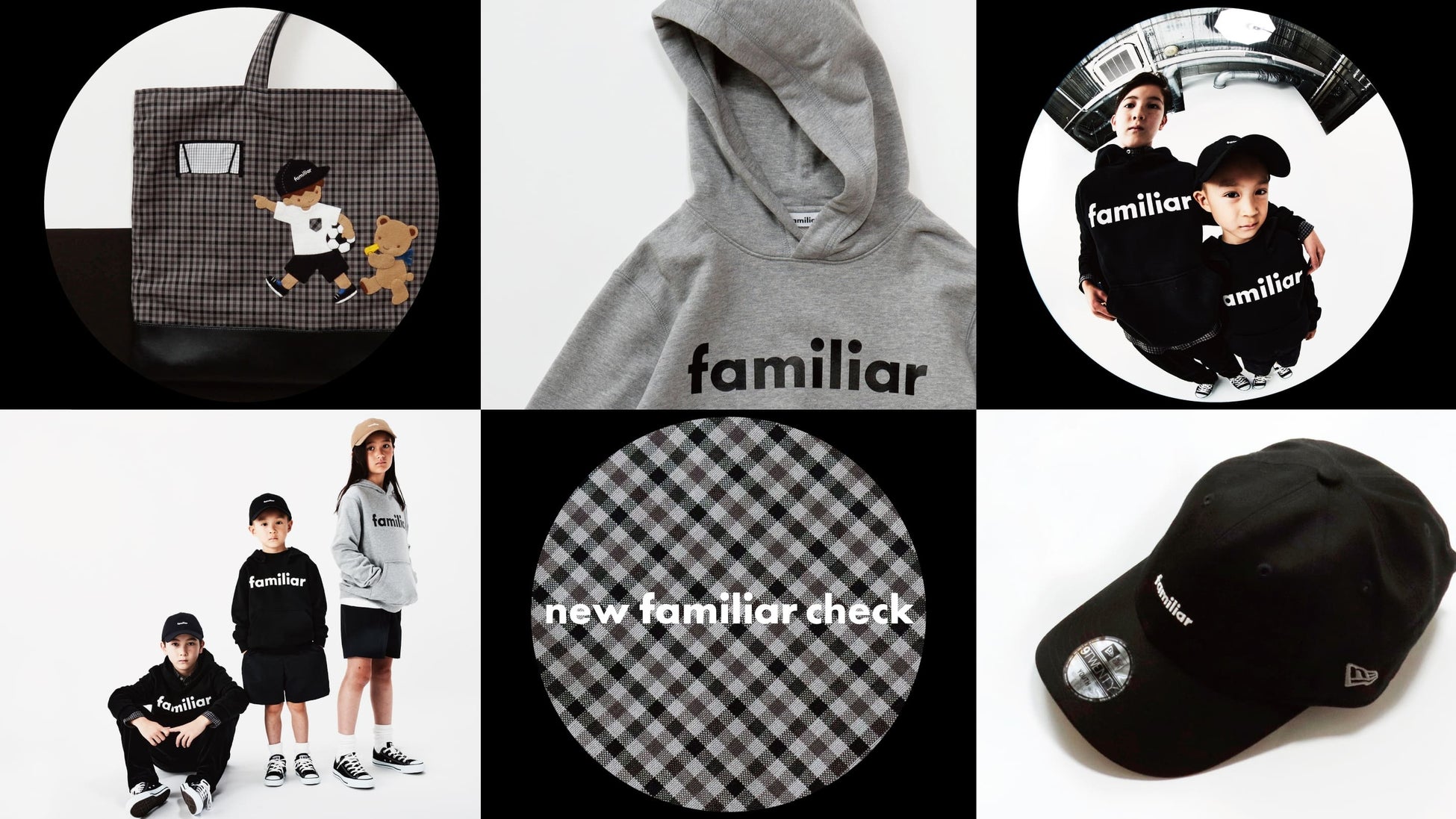 モノトーンカラーの新しいファミリアチェックを取り入れた、男女問わず楽しめるウェアやグッズが新登場。NEW ERA®×familiarコラボアイテムのキャップ、ウェアとリンクしたデザインのバッグもあわせてお楽しみください。