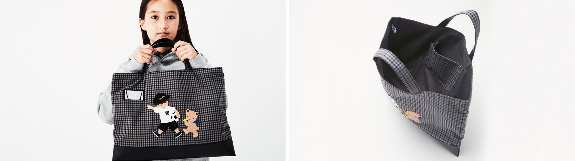 新作チェック「ファミリアチェック(XS)」をベースに用いたバッグ。アートの男の子が着ているお洋服のデザインがリンクしているのがポイントです。ぜひお揃いでお楽しみください。