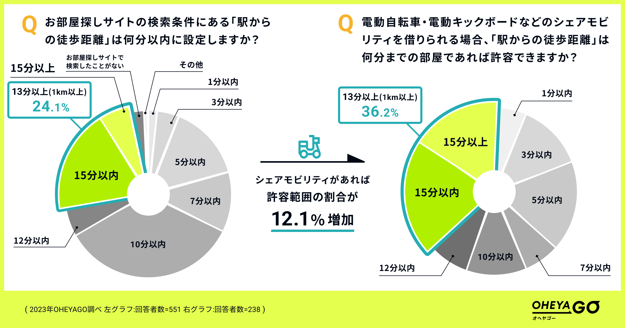 電動キックボードや電動アシスト自転車などのシェアモビリティがある場合、「駅からの徒歩距離」は「13分以上(1km以上)」を許容する人が12.1%増加