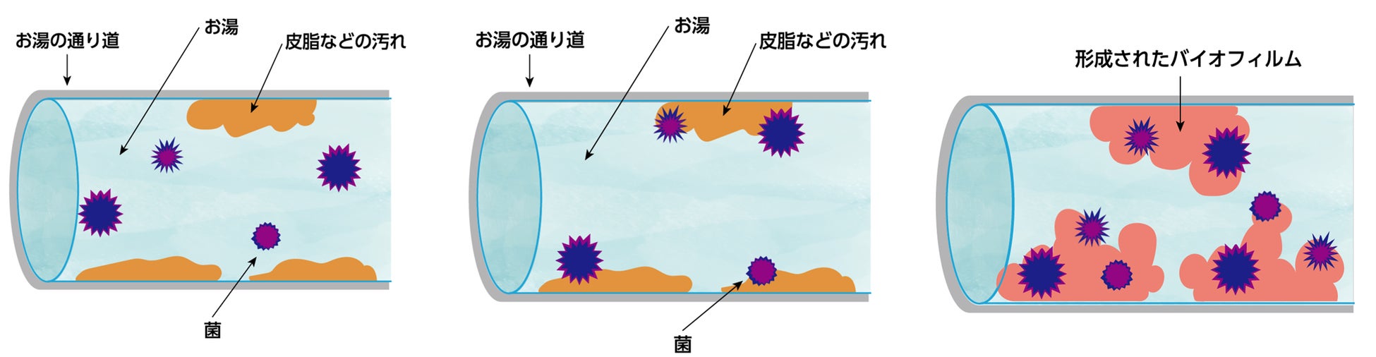 浴室のお手入れは定期的に行っていても、追い焚きなどの配管内のお手入れは定期的に行わないことが多いかと思います。この配管内は、人間の皮脂汚れを主成分としたバイオフィルムが発生・付着しやすく、お手入れが行き届いた浴槽においても、フワフワと浮遊するカスのような汚れがでてくることがあります。そもそもバイオフィルムとは、数種の細菌がコミュニティーを作って増殖した微生物の集合体のことです。細菌が薬剤などの外的要因から身を守るため、キッチンやお風呂の排水口、川底の石にヌルヌルとした膜や、お口内の細菌のかたまりである歯垢などがバイオフィルムに該当します。