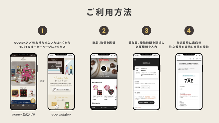 ゴディバ「モバイルオーダー」は、スマートフォンやパソコンから簡単な注文でスムーズに商品をお受け取りいただけるサービスです。
