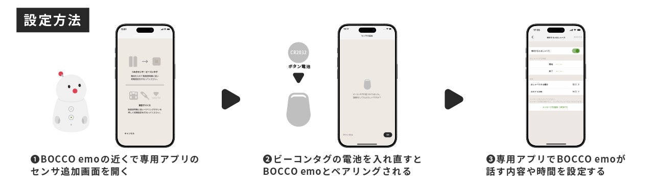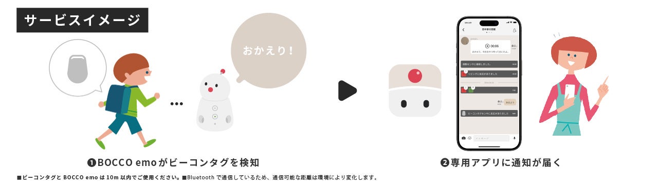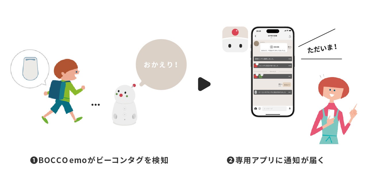 このたびの連携により、ビーコンを持ったお子様や高齢者などがBOCCO emoに近づくと、専用アプリをインストールしたご家族のスマートフォンにビーコンを検知したことを通知するとともに、あらかじめ設定した「おかえり」などのメッセージがBOCCO emo本体から発話されます。